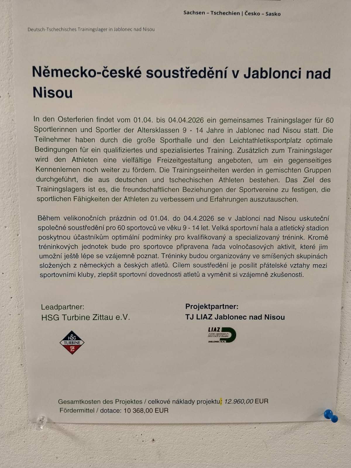 Během velikonočních prázdnin od 01.04. do 04.4.2026 se v Jablonci nad Nisou uskuteční společné soustředění pro 60 sportovců ve věku 9 - 14 let. Velká sportovní hala a atletický stadion poskytnou účastníkům optimální podmínky pro kvalifikovaný a specializovaný trénink. Kromě tréninkových jednotek bude pro sportovce připravena řada volnočasových aktivit, které jim umožní ještě lépe se vzájemně poznat. Tréninky budou organizovány ve smíšených skupinách složených z německých a českých atletů. Cílem soustředění je posílit přátelské vztahy mezi sportovními kluby, zlepšit sportovní dovednosti atletů a vyměnit si vzájemně zkušenosti.